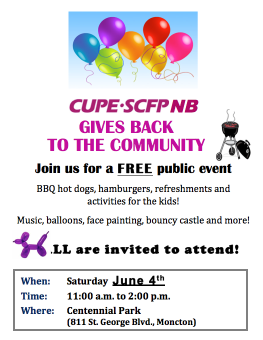 « All Events This event has passed. CUPE Give Back June 4, 2016 @ 11:00 am - 2:00 pm Free Event Navigation « Spring Meet & Greet General Membership Meeting » + Google Calendar+ iCal Export Details Date: June 4, 2016 Time: 11:00 am - 2:00 pm Cost: Free Organizer CUPE SCFP NB Venue Centennial Park 811 St George St. Moncton, NB Canada + Google Map